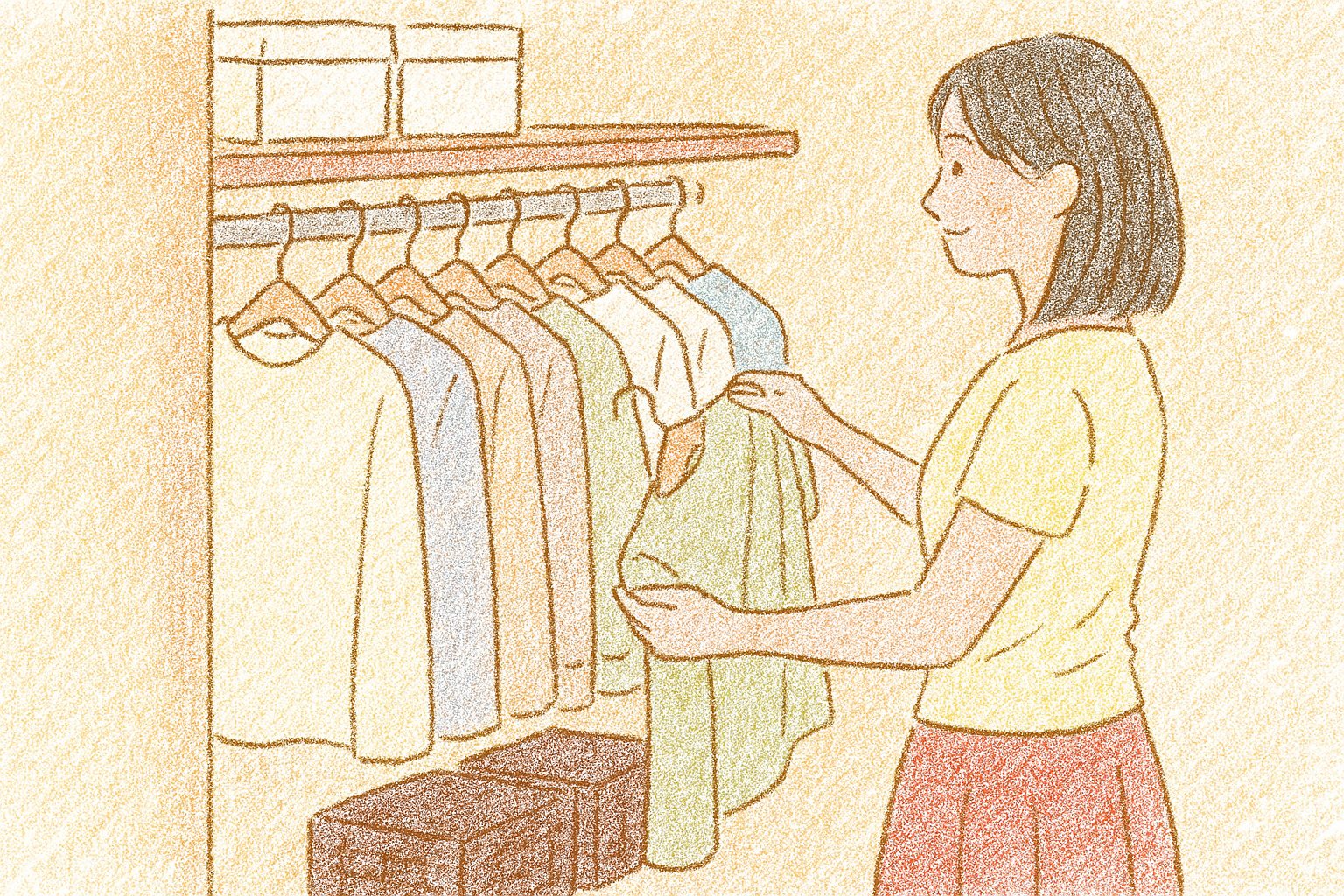 - 素材と色を限定する: 真冬のダウンと真夏のノースリーブなど、極端なものを除き、年間通して着られるウール混のカットソーや、オールシーズン使えるデニムなど素材の汎用性を重視します。