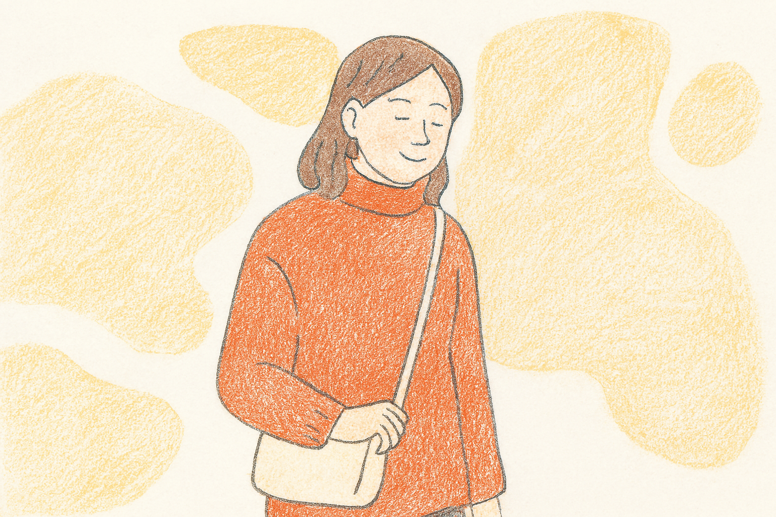 ニットは暖かみのあるマットな質感です。ここに、レザーバッグやエナメル素材の靴など、「艶(つや)」のあるアイテムを一点加えるだけで、メリハリが生まれて一気に都会的な印象に格上げされます。